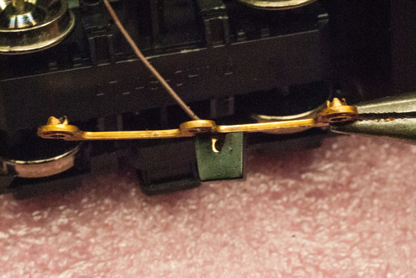 The solution was to solder the wire to the side frame. We also corrected bends in the side frames which helped hold the wheels in proper alignment.