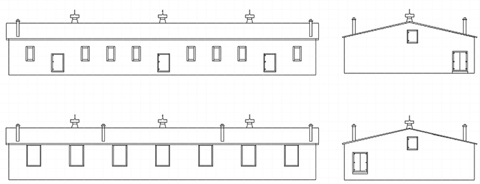 Taking another look at the model I know I will not be able to use a warehouse that is over 26 inches long on my layout so I have looked at foreshortening the building. Below are drawings of the front, back and ends of the warehouse in full size and in a shorter version.